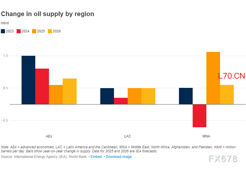 2025年,中东和北非、阿富汗及巴基斯坦(MNA地区)的石油供应增长预计将恢复,拉丁美洲和加勒比地区(LAC地区)将加速增长,而发达经济体的供应增长则会放缓。2025年石油供应增量中,近一半来自石油输出国组织及其合作伙伴(OPEC+),这反映出该组织提高了产量目标。