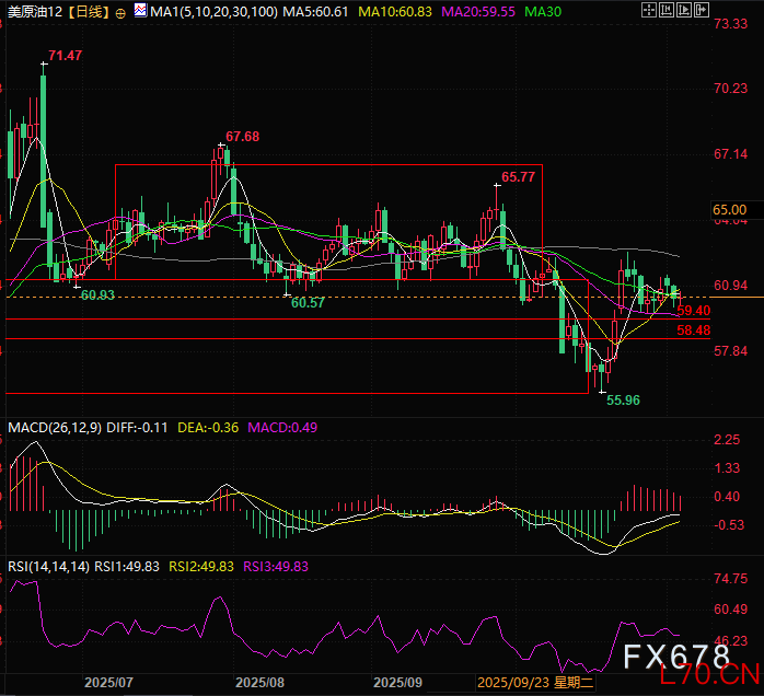 美原油12月期货合约目前维持在箱体上半区域呈现震荡走势,压力位在61.30支撑位在59.40和58.48附近。