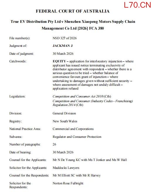 针对此次纠纷,TrueEV称小鹏“过河拆桥”,试图绕开独家代理、自建直营网络,同时指控小鹏干涉其融资、切断支持,导致其资金链断裂。其曾向法院申请禁令,但该申请被澳大利亚当地法院于今年4月1日予以驳回。