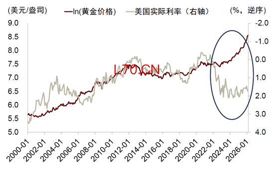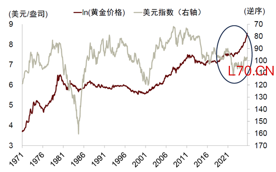 传统的黄金定价框架也面临挑战,也就是说,传统的黄金的定价逻辑对金价的解释力下降了。比如,历史上黄金价格和美国实际利率负相关性比较明显,实际利率代表实体的回报率,是持有黄金的机会成本。因为黄金通常用来对抗通胀,所以剔除通胀的实际利率能更好地刻画其机会成本。但是,2022年以来这个关系被打破,黄金价格和美国实际利率同时上行。再比如,黄金以美元计价,因此当美元贬值时,以美元计价的黄金价格会上涨。同样,2022年以来这个关系减弱,美元指数和黄金同时上涨。