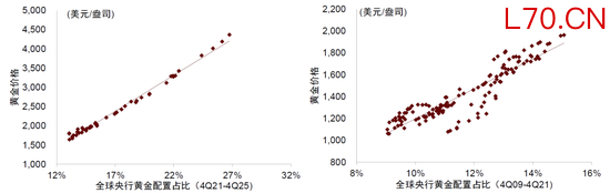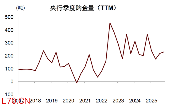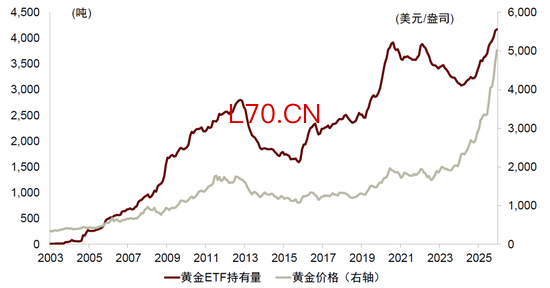 实际上,如前所述,过去几个季度以来,全球央行增持黄金的动机比较稳定,增持速度放缓或者小幅减持。从4Q21到4Q25,全球央行黄金配置占比与黄金价格相关性非常明显。4Q09-4Q21期间,全球央行购金和黄金价格也有一定正相关性,但不如4Q21-4Q25期间显著。基于4Q21到4Q25期间的全球央行黄金配置占比与黄金价格的相关性,我们做了一个简单估算作为参考。央行之外,非政府投资者持有黄金可能更多是增值的目的(消费属性更多出于装饰目的),顺周期行为比较明显。以黄金ETF为例,因其投资的便捷性,是机构和个人投资者投资黄金的重要工具。我们发现黄金ETF的持有量通常与黄金价格正相关,体现出“追涨杀跌”的特点。