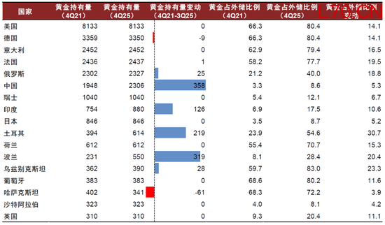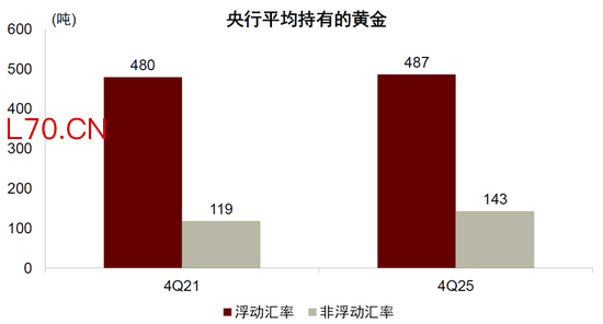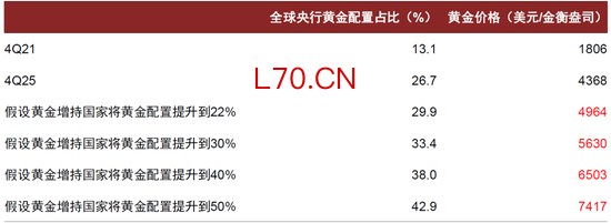 注:4Q25,俄罗斯央行的黄金配置占比接近40%;土耳其央行的黄金配置占比接近55%,是非浮动汇率制国家中配置比例最高的。提升到22%的情境中,主要是假设中国、印度、新加坡、伊拉克、利比亚、巴西、墨西哥等国家增持黄金。提升到30%的场景中,除了在22%场景中的国家外,还假设波兰、南非、卡塔尔等国增持黄金。提升到40%的场景中,除了在22%和30%场景中的国家外,还假设埃及、约旦、巴基斯坦等国增持黄金。提升到50%的场景中,除了在22%、30%、40%场景中的国家外,还假设俄罗斯、白俄罗斯增持黄金