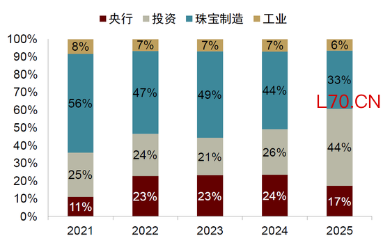 黄金有三大属性,即投资、消费和工业属性,2025年黄金的投资属性明显增强。其投资属性因为黄金物理上具有稀缺性,金融上具有抗通胀、非主权、避险属性。消费属性因为黄金是珠宝制造的原料,而其工业属性是因为黄金具有良好的导电性、抗腐蚀性,主要在高端科技产业中应用。但黄金工业属性在价值中占比是最低的,这几年在7%左右徘徊,而其投资属性2025年达到了44%,较2024年上升16个百分点。