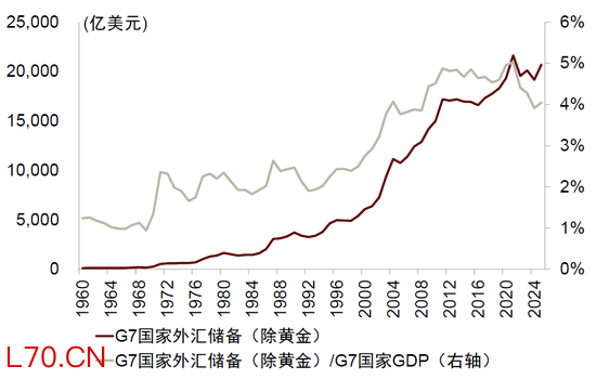 再看全球央行的外汇储备构成的变化。1900年左右黄金价值在全球官方储备中占比高达90%左右,1971年布雷顿森林体系解体后,黄金价值占比一度降至40%左右。1980年代滞胀时期黄金比重升至60%以上,但到2007年大概只有10%左右,但过去几年又出现逐步上升态势。2025年黄金在全球央行外汇储备中的占比为26%,超过了美国国债,这是过去30年来的新现象。根据国际货币基金组织(IMF)数据库,截至2Q2025,全球官方储备中有7.4万亿美元资产。根据美国财政部的数据,截至2Q2025,外国官方持有的美元资产为6.9万亿美元,和IMF数据大体能对上。其中,股票类资产为2.2万亿美元,长期美债为4.3万亿美元,短期美债为0.4万亿美元[1]。长期美债中,美国国债为3.5万亿美元,机构债为0.6万亿美元,企业债为0.2万亿美元[2]。