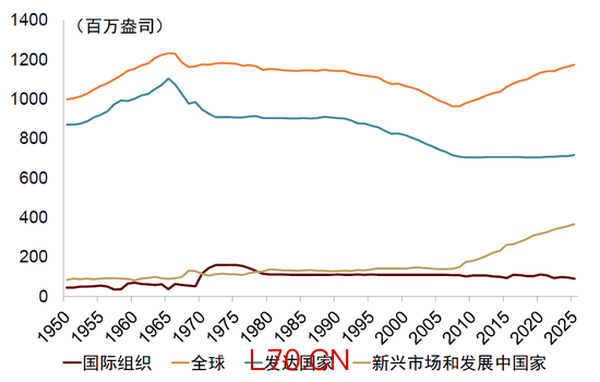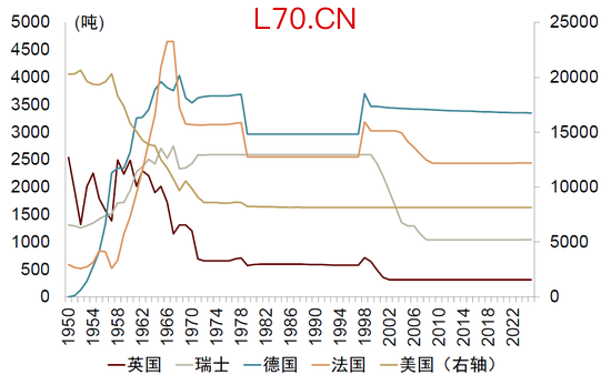 如果从汇率制度来看,2021年底到2025年底期间,浮动汇率经济体央行增持黄金不多,非浮动汇率制经济体增持相对多一些。实际上,发达经济体央行的外汇储备本身比较稳定,因为其汇率体制以浮动汇率制为主,不需要维持大量外汇储备。这也意味着发达经济体央行增持黄金的空间天然难以大幅上升。1960年代,美国为维持布雷顿森林体系,允许其他国家用美元换取黄金,美国的黄金储备从1950年的20,000吨下降到1971年的约8,000吨。1961-1968年,美国和七个欧洲国家的央行共同设立伦敦黄金池(London Gold Pool),通过干预伦敦黄金市场来维护每金衡盎司 35 美元的黄金价格。1990年代,欧元区各国央行重组,减少外汇中的黄金配置比例。1999年,欧洲央行设立《央行黄金协议》(Central Bank Gold Agreements),规定了成员国每年黄金减持上限,避免成员国央行无序抛售黄金。数据显示,英国、瑞士、德国、法国和美国央行过去几十年来持有黄金数量一直比较稳定。