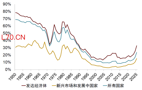 那么,央行增持黄金是不是全球普遍现象?数据显示,自1960年代开始,发达国家央行持有的黄金实物存量呈现趋势下降的态势,但过去20年来变化不大(期间主要是新兴市场和发展中国家的央行增持黄金)。如果从黄金总值在官方储备中的占比来看,近几年发达和欠发达经济体这个比重都出现上升的态势,一个原因是金价快速上升,不完全是配置的量上升所致。