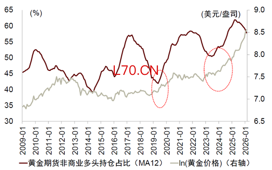 有何前瞻指标判断金价呢?一个指标是期货多头头寸持仓占比。从2016年到2023年期间,黄金期货非商业多头头寸持仓占比如果阶段性见底,接下来金价可能走强。从2025年年中以来,这个指标持续下行了一段时间,这是否代表金价短期将再次走强?