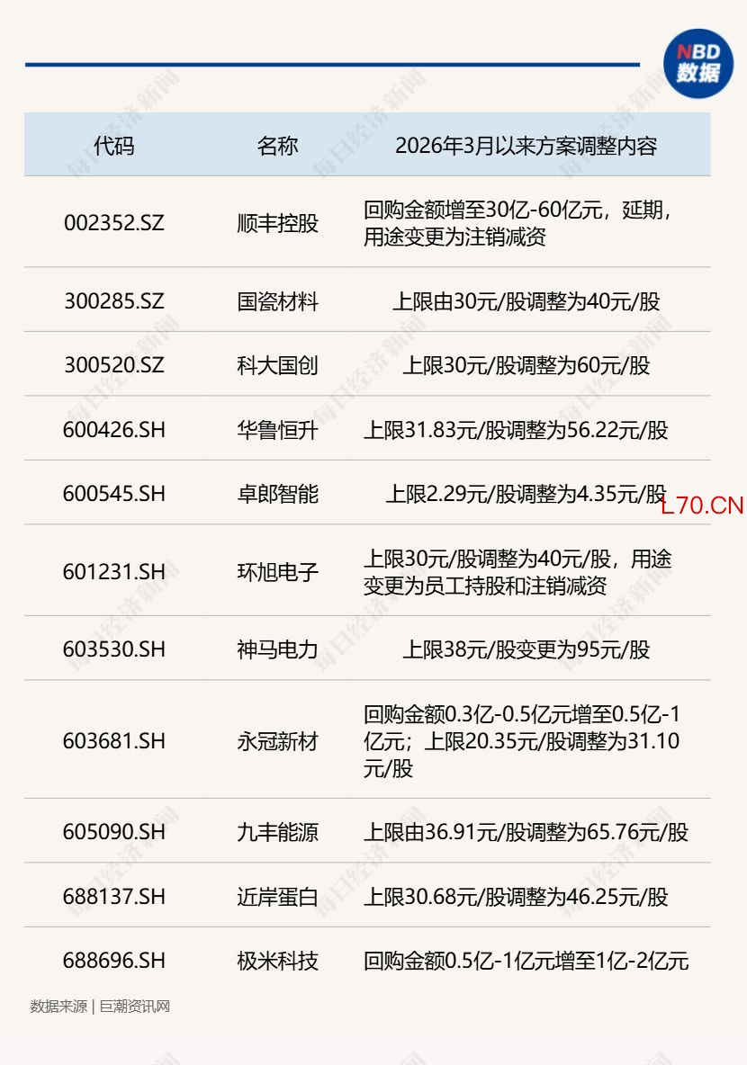 市场震荡调整背景下,像顺丰控股一样调整回购方案的并非个案。据每经记者梳理,3月以来已有11家公司宣布调整回购方案(其中有3家是4月公告),调整内容主要集中在上调回购价格上限、增加回购金额、变更回购用途等方面,部分公司同步实施多项调整。
