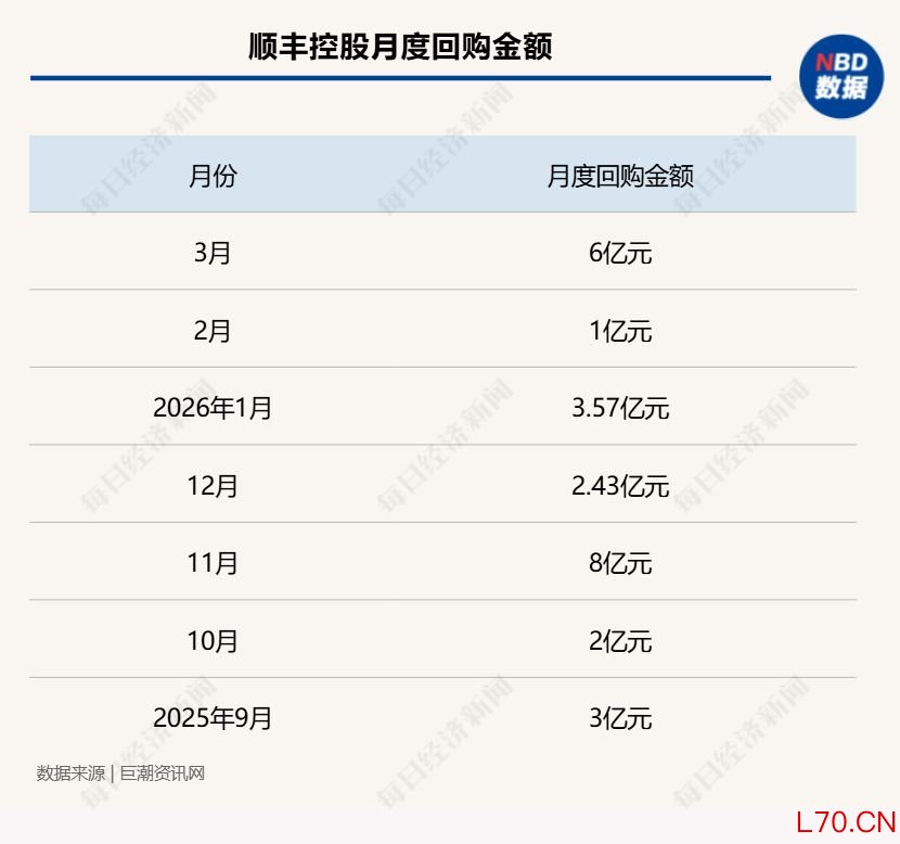顺丰控股3月回购力度较前面月份有显著提升,单月回购6亿元,截至3月底累计回购26亿元。同时,公司于3月底再度调整回购方案,将回购金额由15亿元~30亿元增加至30亿元~60亿元,延长实施期限,并将回购用途由员工持股计划或股权激励变更为注销减资。这已是公司第二次上调回购规模,较2025年4月最初披露的5亿元~10亿元方案,最新规模扩大至原来的6倍,资金来源为自有资金。