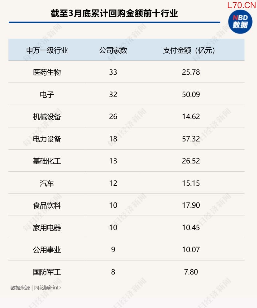 据同花顺数据统计,正在实施回购的公司中(3月宣布完成回购的公司数据除外,下同),约有244家公司披露了截至3月底的回购进展,累计支付金额约365.17亿元。行业分布上,医药生物、电子、机械设备和电力设备等行业公司数量居前,分别有33家、32家、26家和18家;其中电力设备行业18家公司累计支付金额达57.32亿元,为各行业最高。