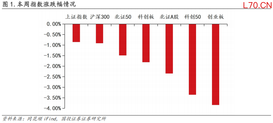 本周上证指数下降0.86%,北证A股指数下降2.35%,跑输上证综指1.49pct;北证50指数下降1.49%,跑输上证综指0.63pct;创业板指数下降3.84%,科创板指数下降1.81%。