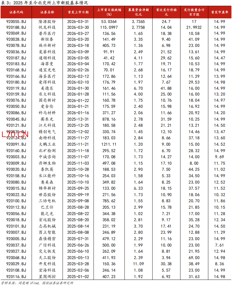 2025年1月1日至2026年4月3日,北交所共有42家企业新发上市,本周新上市2家,分别为悦龙科技和隆源股份,上市首日涨幅分别为115.10%和53.04%,42家新股上市首日涨跌幅中位数218.16%,市盈率中位数14.50X。