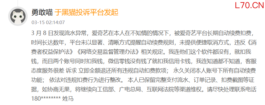 3月15日,有网友投诉先前发现银行流水异常,“爱奇艺在网友本人在不知情的情况下,长期自动续费扣费长达数年。平台未以显著、清晰方式提醒自动续费规则,未提供便捷取消方式,违反《消费者权益保护法》《网络交易监督管理办法》相关规定。”网友表示,并没有使用该软件就产生扣费,而且两个账号同时扣钱,微信零钱没有钱了就扣信用卡钱。并且客服态度服务很差。诉求是立即全额退还所有违规自动扣费款项; 永久关闭本人账号下所有自动续费功能; 依法对违规扣费行为进行整改。