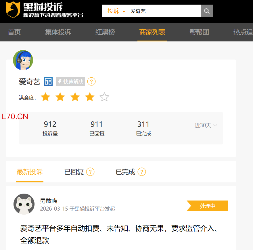 深圳商报读创客户端记者查询发现,黑猫投诉平台上,近30天有关爱奇艺的投诉量达到912条,其中大部分都与会员费有关。