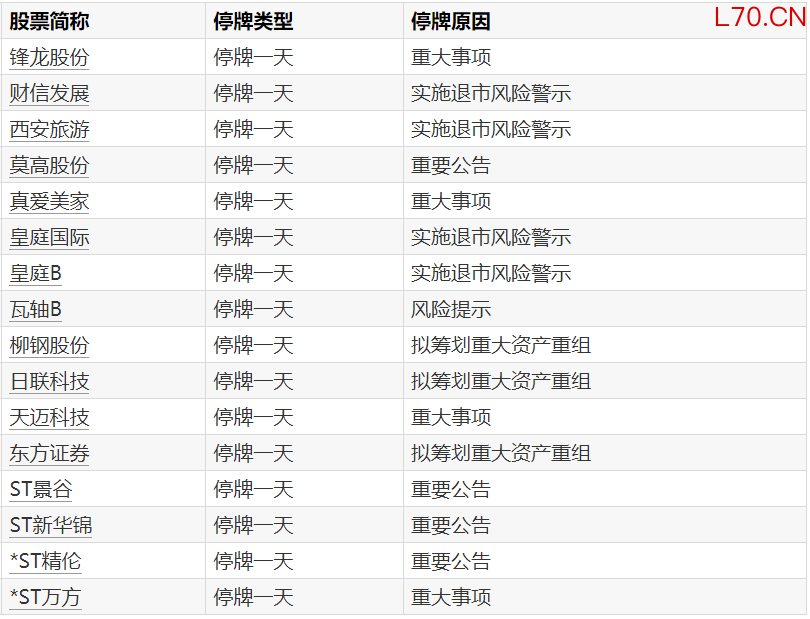 A股停牌提示:16股今日停牌