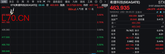 存储概念股盘初集体走强。希捷科技大涨超8%,闪迪涨超4%,西部数据涨近4%,美光科技涨近3%。消息面上,摩根士丹利将希捷科技纳入其“首选股名单”。